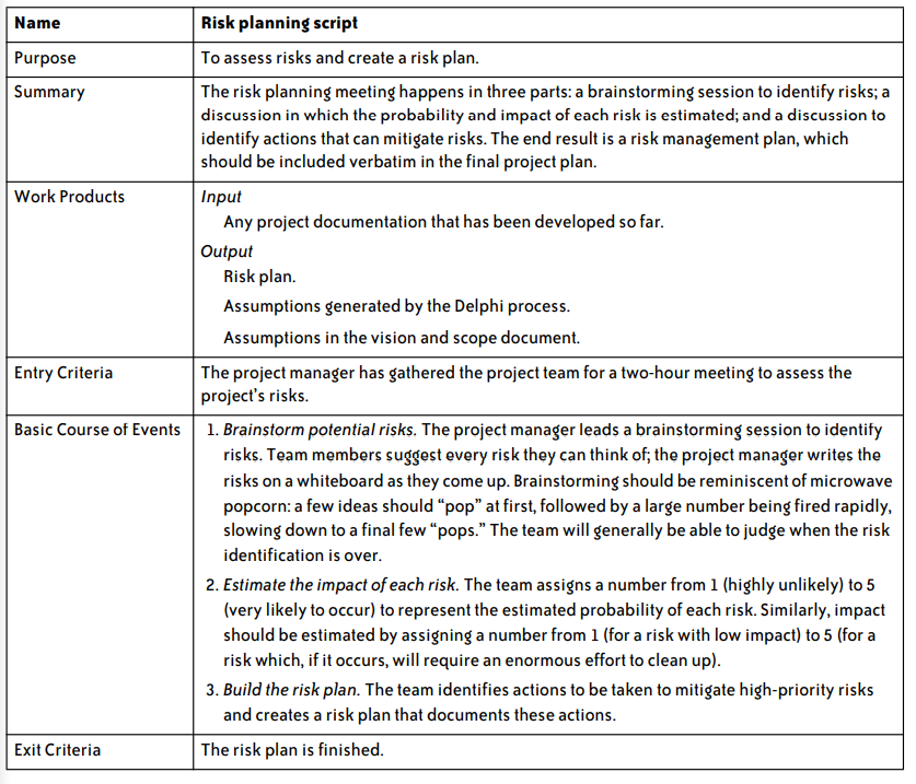 A Risk Plan can be done in one meeting, properly 1 or 2 hours long. And there can be a script for manufacturing the RP.